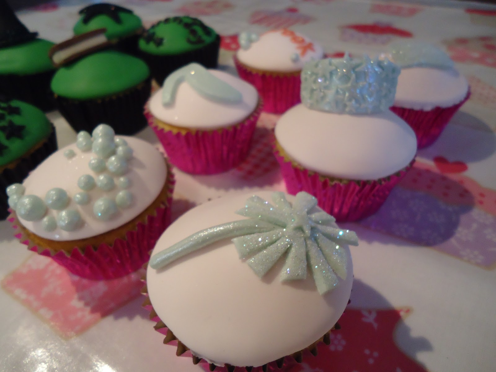 Wicked is the story of two witches and how one became good and one.... wicked. Brook looooooooves the musical so it made sense to make her Wicked themed cupcakes. Glinda's 'good witch' cakes were topped with pink fondant domes and sparkly wand, tiara, shoe & bubbles. Elphaba's 'bad witch' cakes were green fondant tops with witches hat, broom, Grimmerie (spellbook) and sparkly stars.